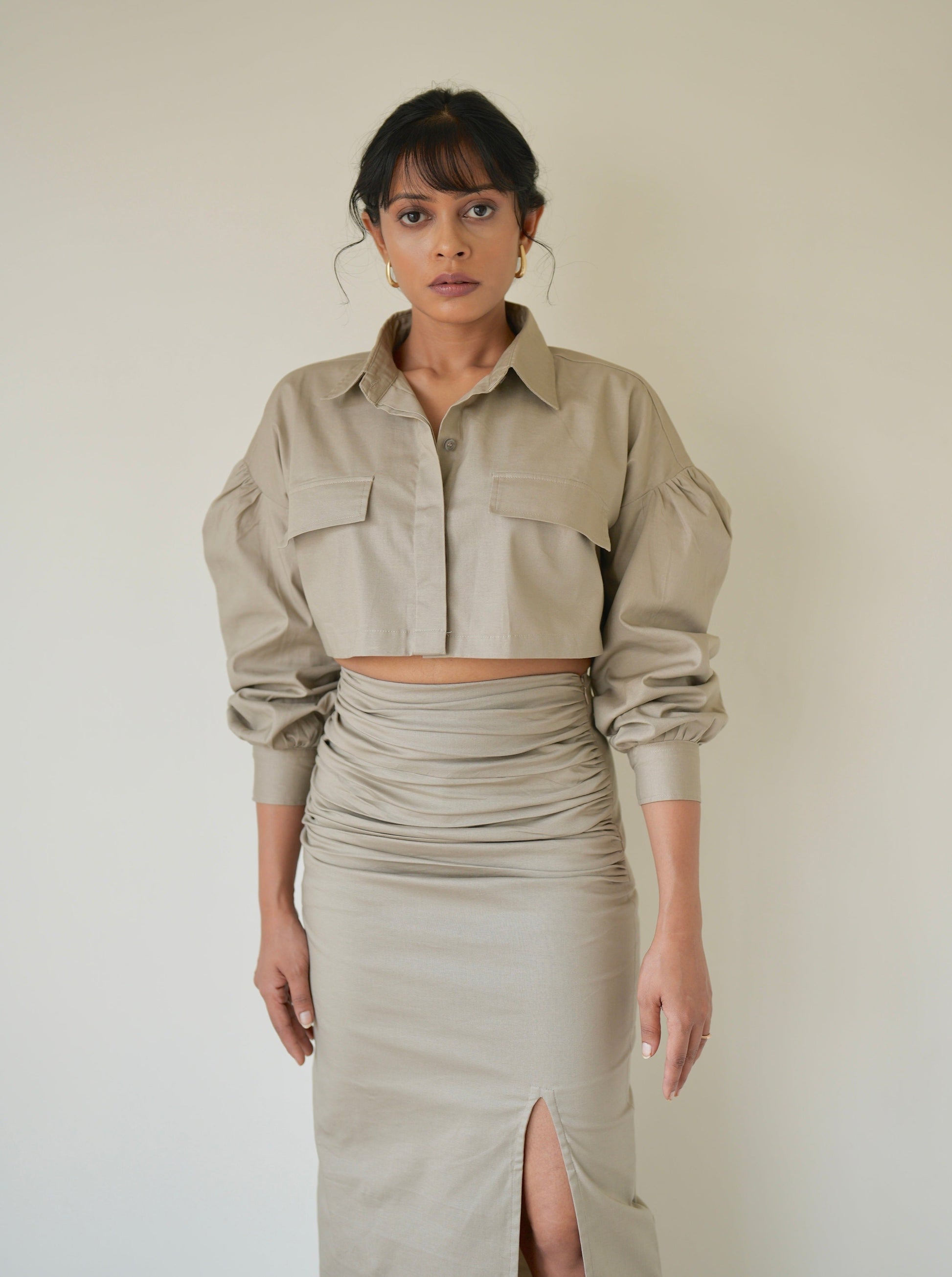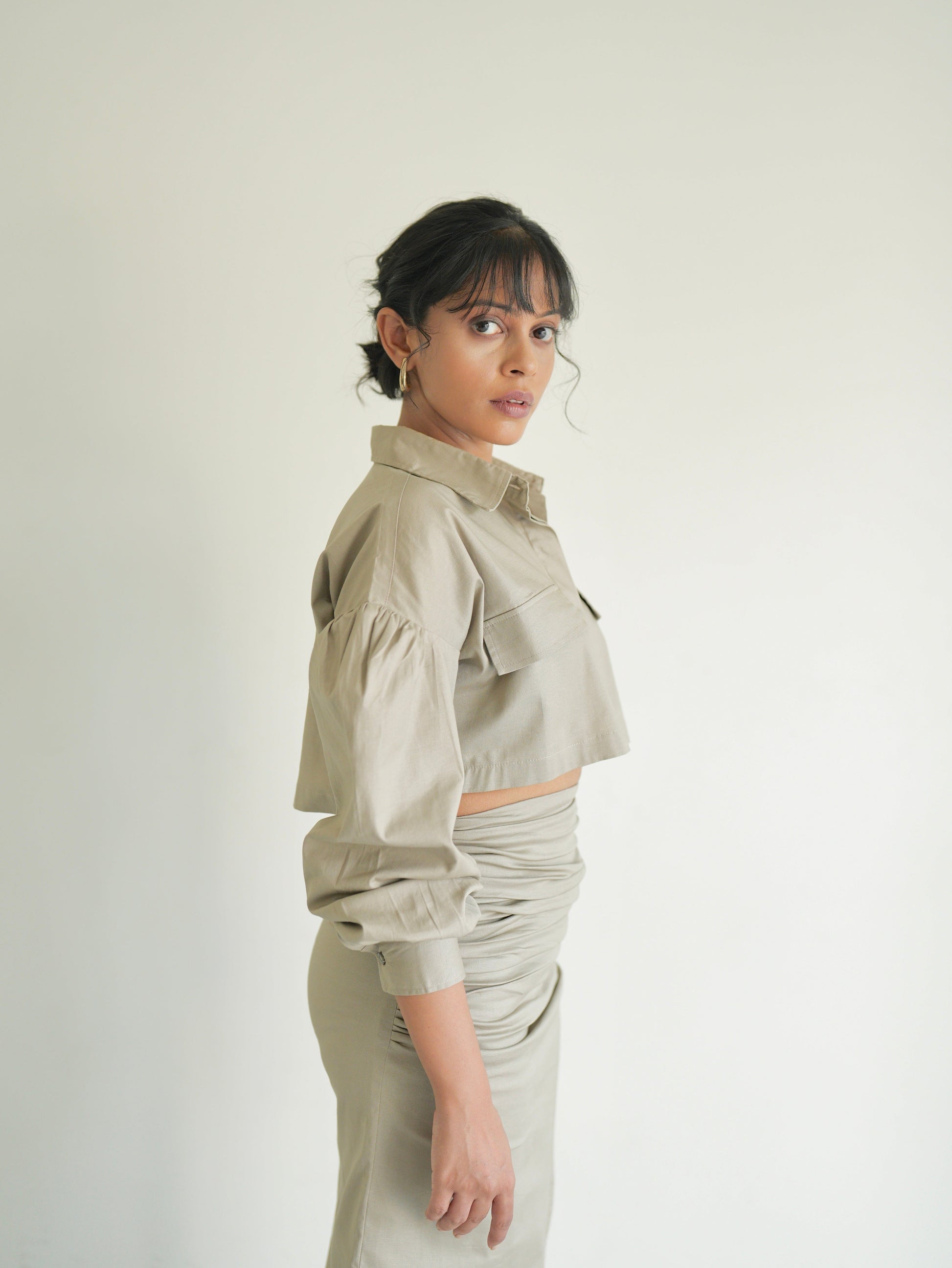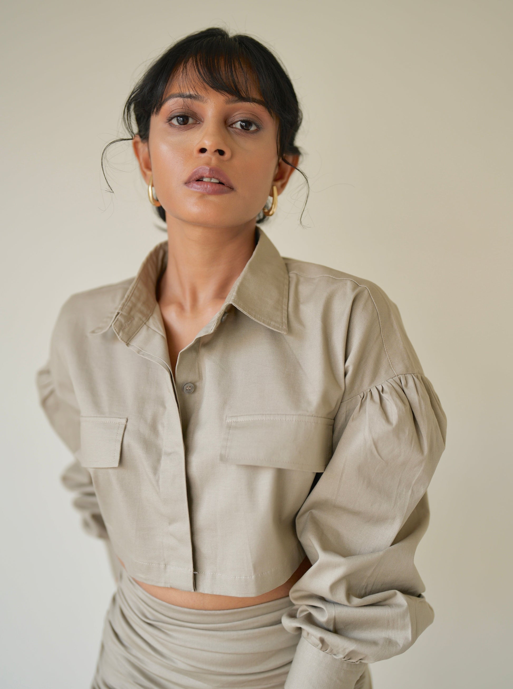A contemporary twist on casual comfort. Made from cotton stretch fabric in a muted beige hue, the Shroom Boxy Shirt boasts a cropped, boxy silhouette with sleeves featuring relaxed drooping shoulders and delicate gathers finished with pocket flap detailing, it's the epitome of relaxed refinement.
