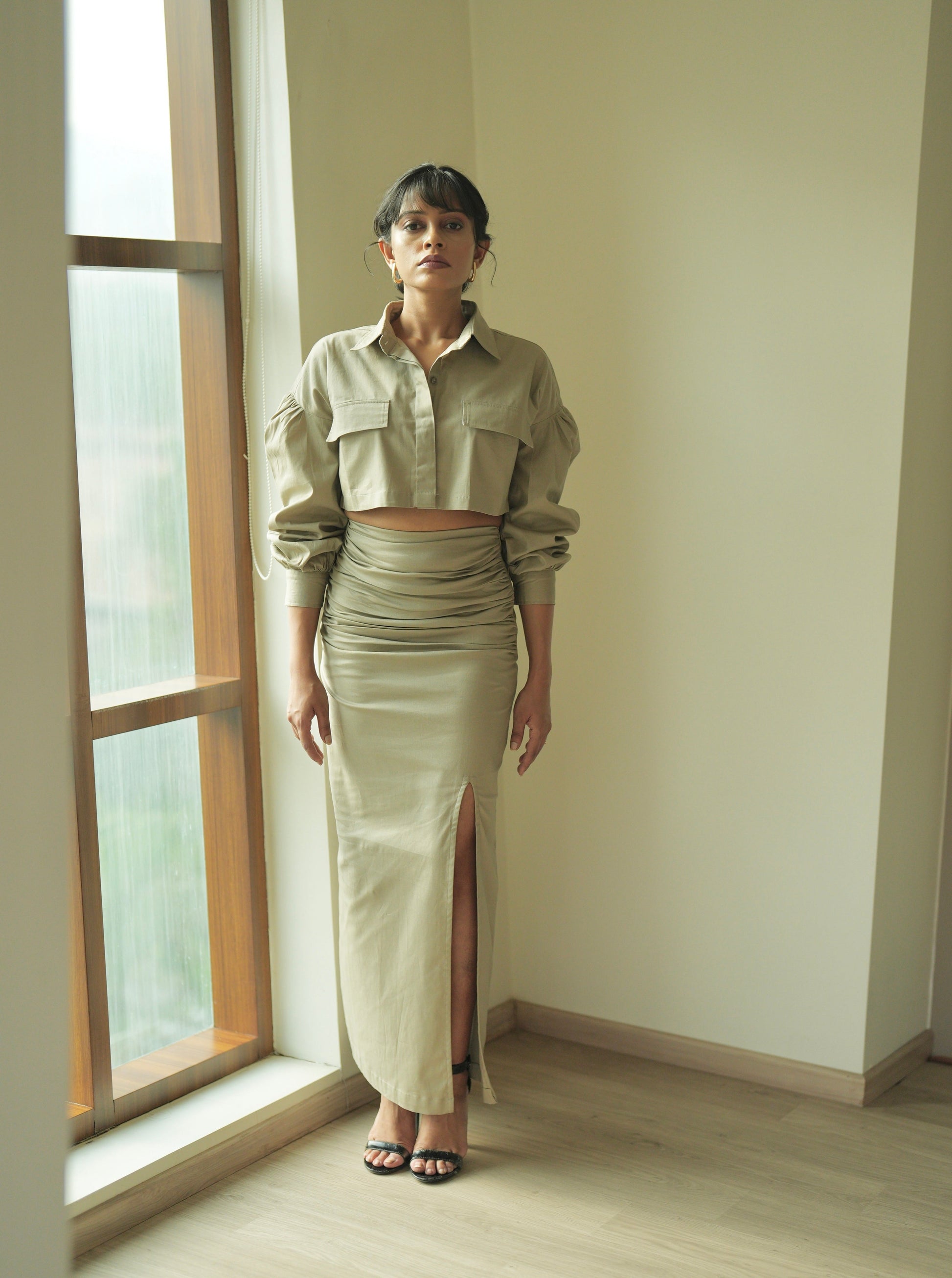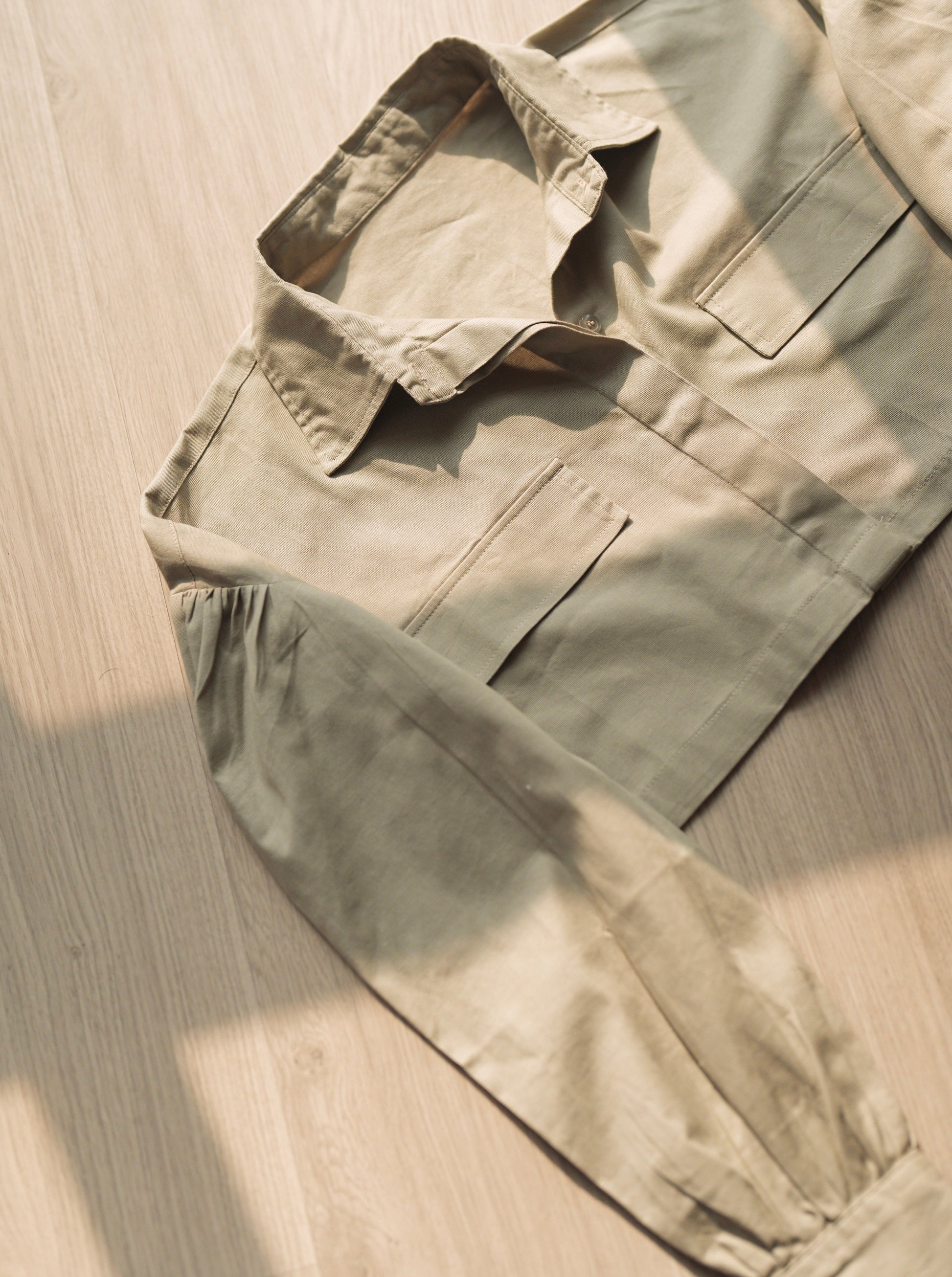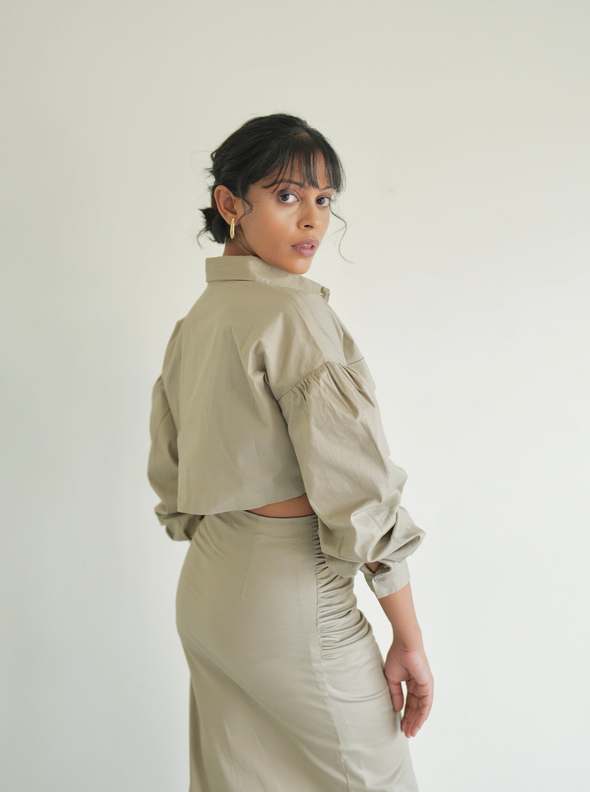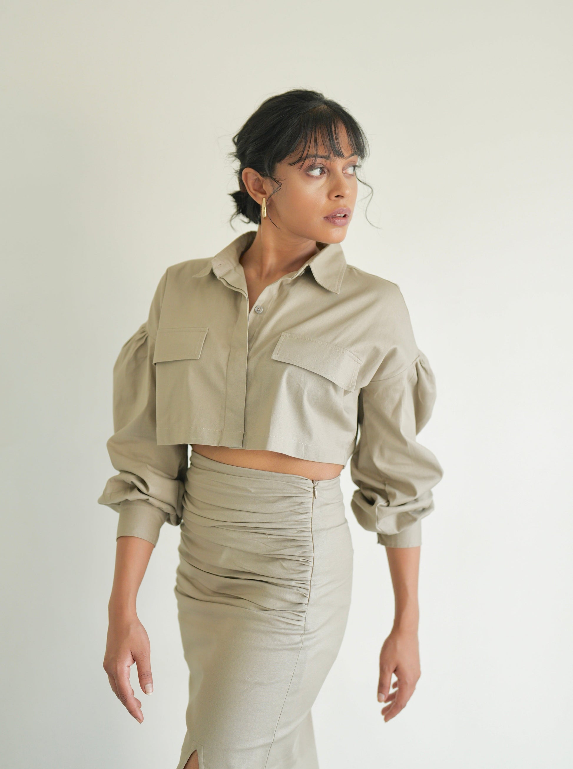 A contemporary twist on casual comfort. Made from cotton stretch fabric in a muted beige hue, the Shroom Boxy Shirt boasts a cropped, boxy silhouette with sleeves featuring relaxed drooping shoulders and delicate gathers finished with pocket flap detailing, it's the epitome of relaxed refinement.