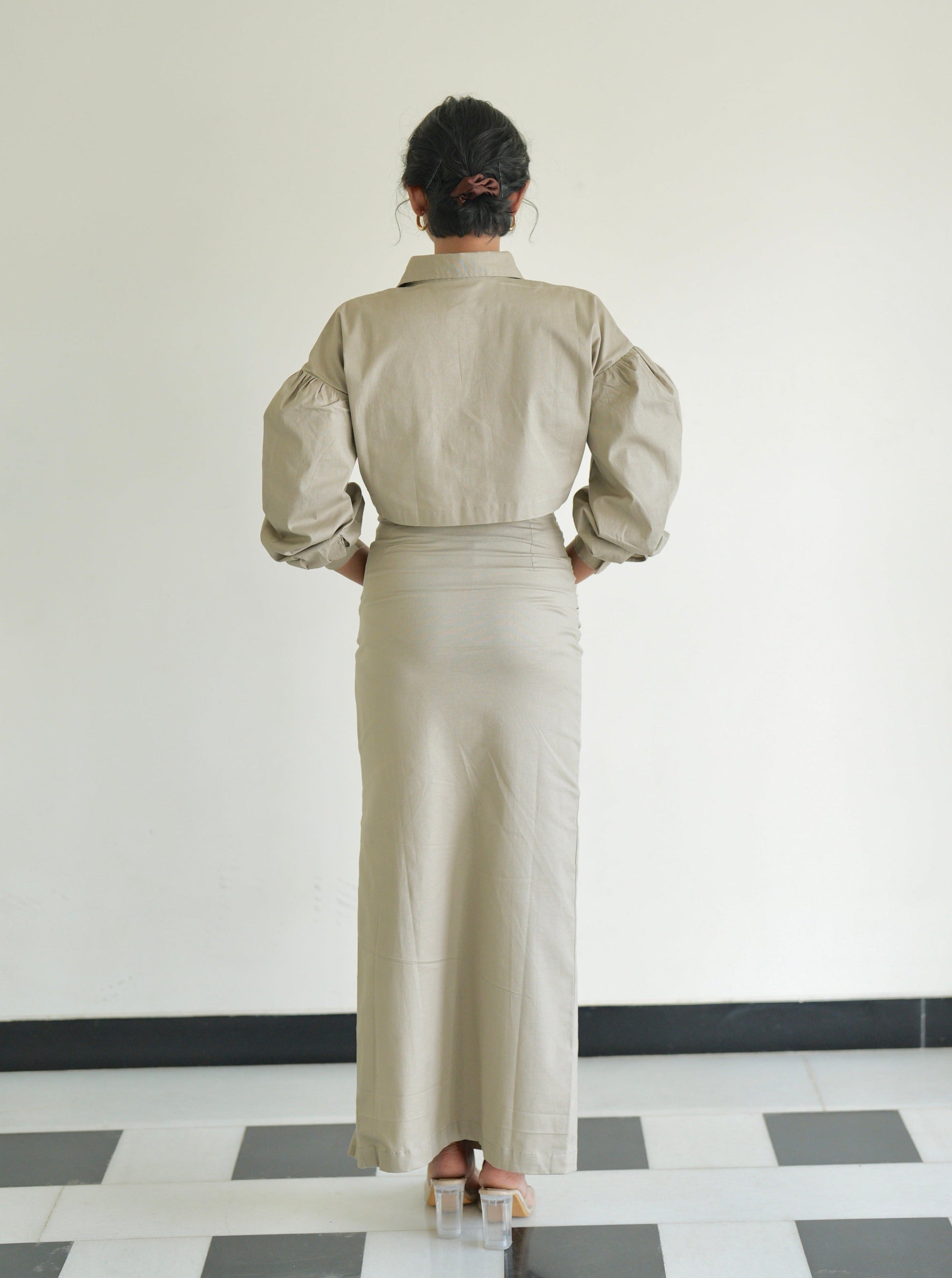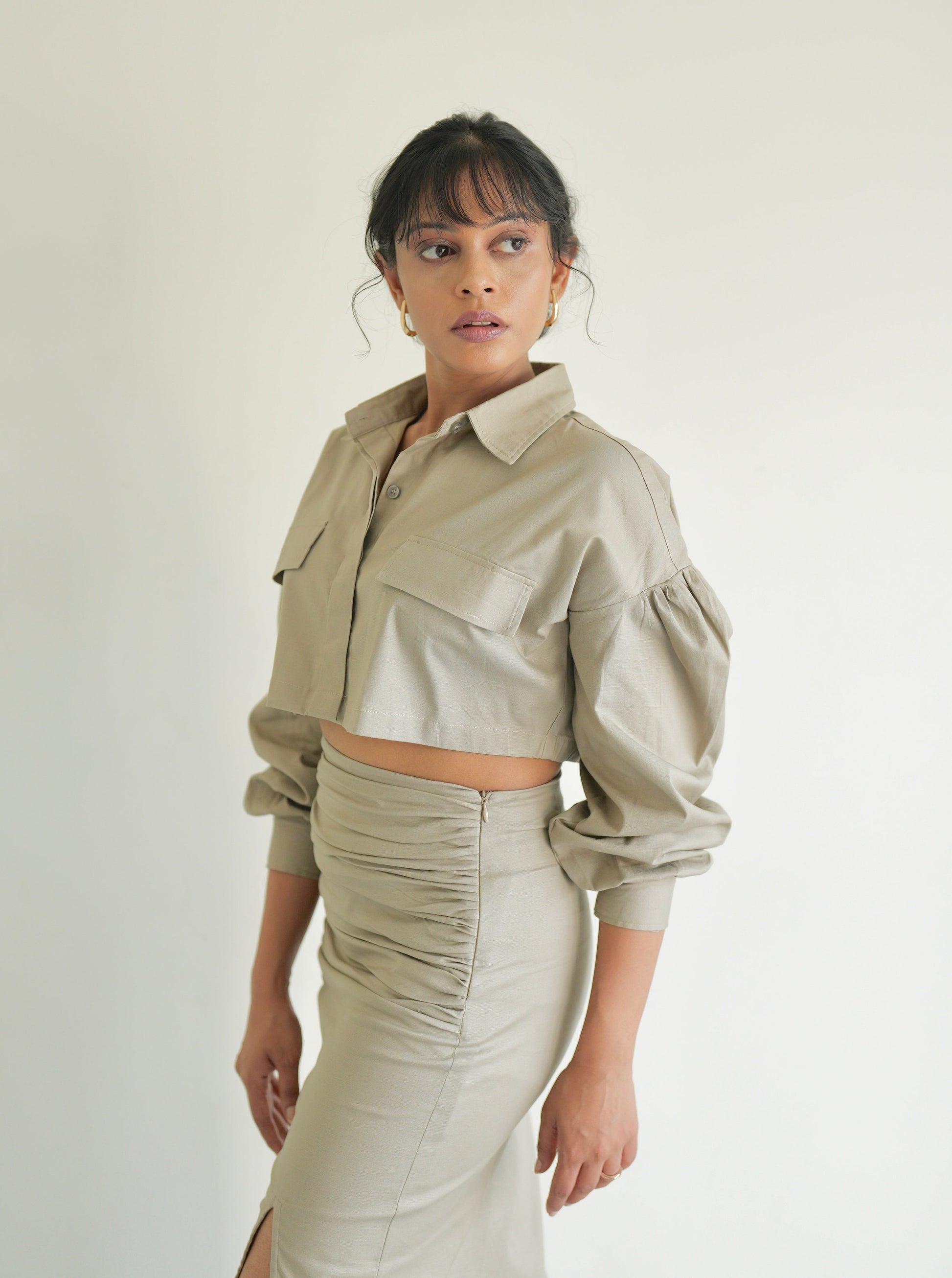 Crafted from cotton stretch fabric, this piece offers both style and comfort. The straight fit silhouette is elevated by hand-drawn gathers on either side, creating a flattering waistline and ensuring easy movement. Complete with a sturdy side zip and a slit this versatile piece transitions seamlessly from a bossy fit for work to a stylish GNO!