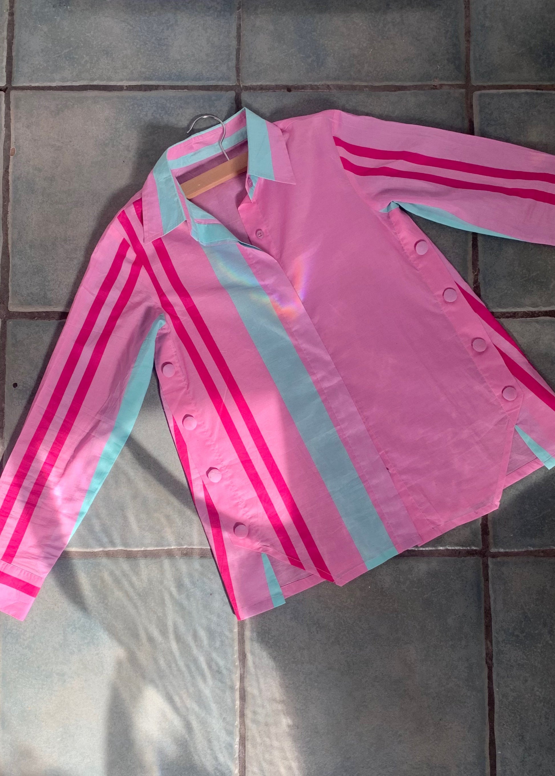 Your ever so summer shirt with light and bright colours and an asymmetrical hem that gives you the perfect tucked-out shirt look.
