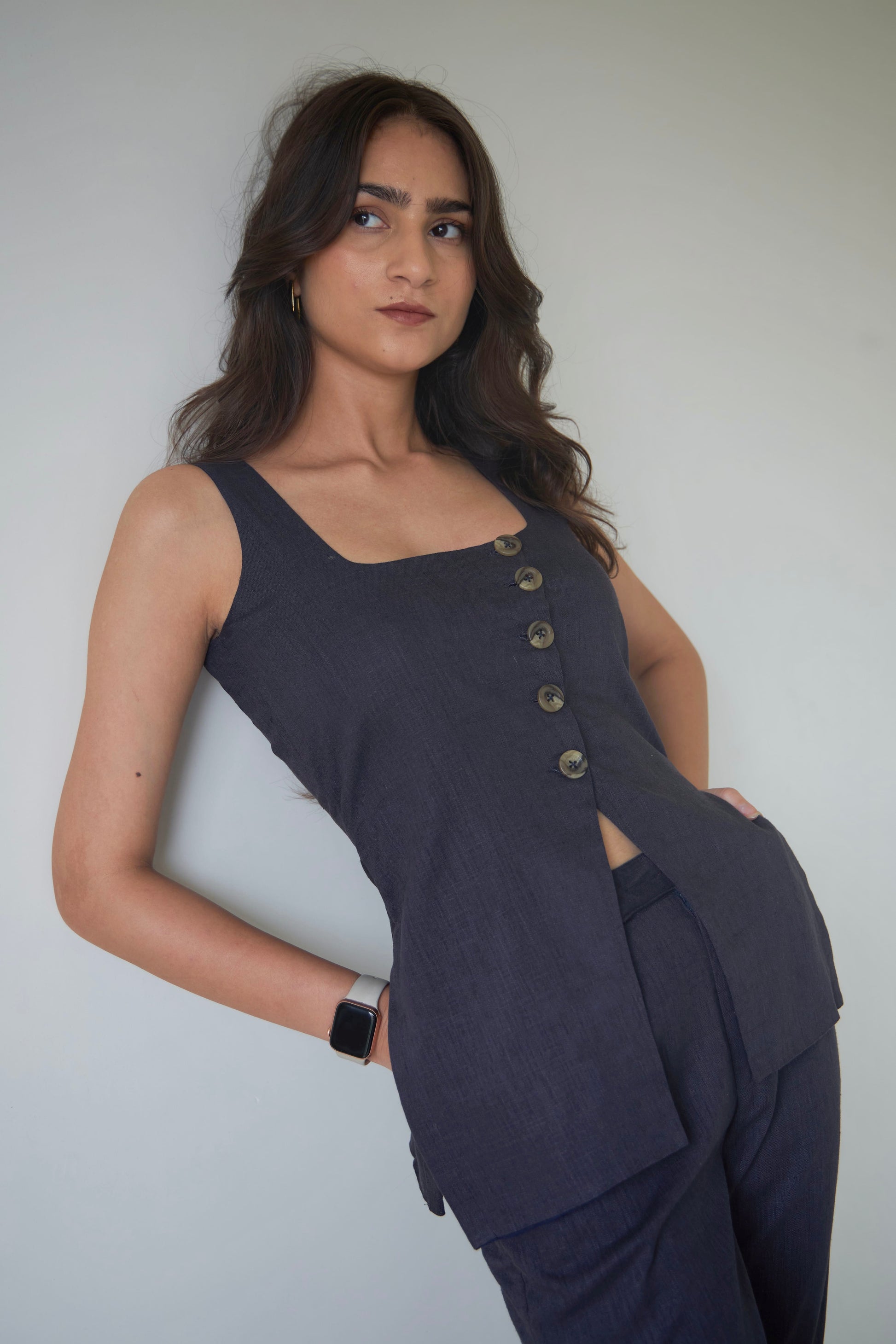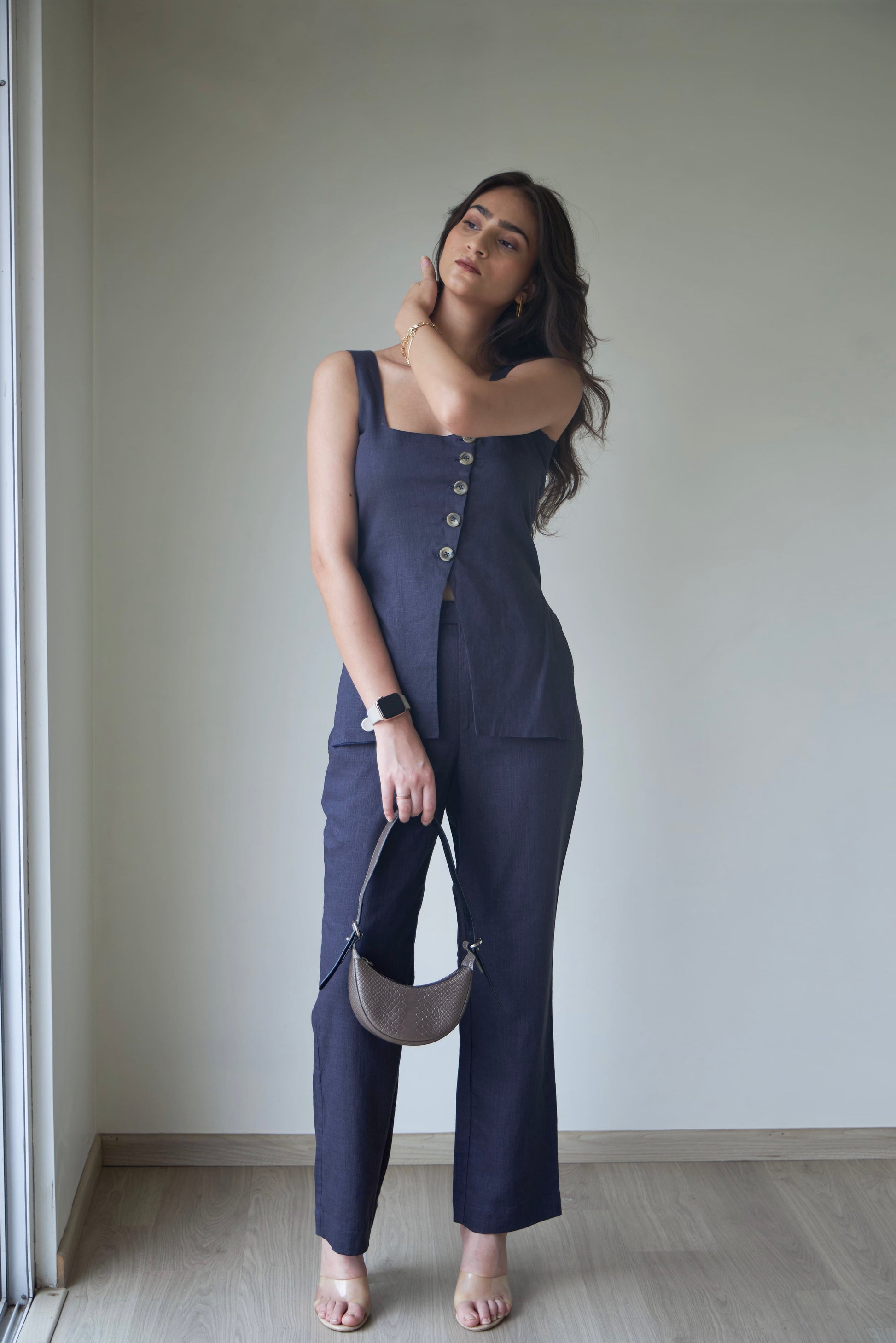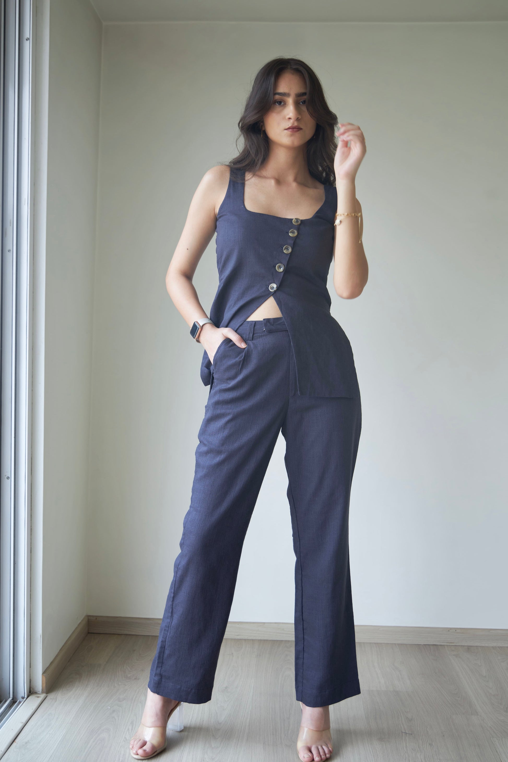 Introducing the Dusky Blue Pant Set, a perfect blend of style and comfort for your summer adventures. This set features a square neck top with a buttoned front, complete with center and side slits that enhance its breezy, summery vibe. Paired with parallel trousers that boast a button fly opening and convenient side cut pockets.