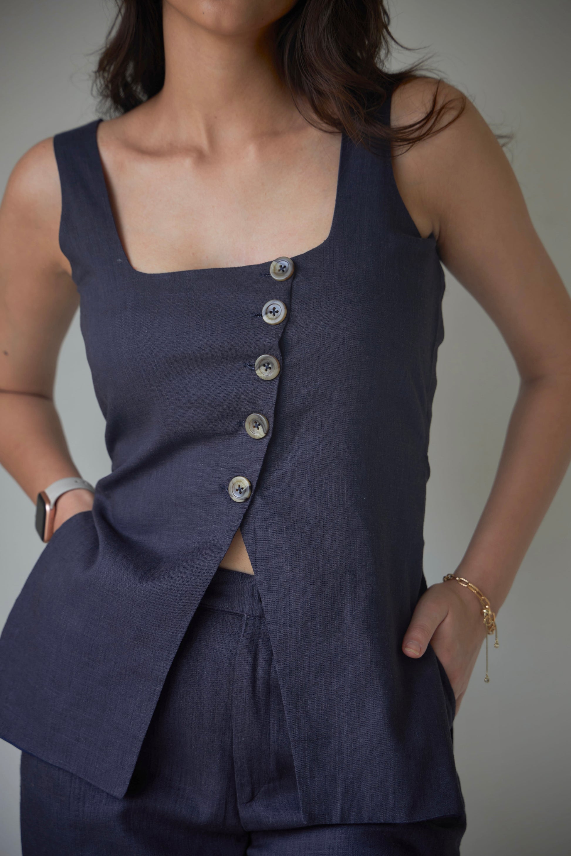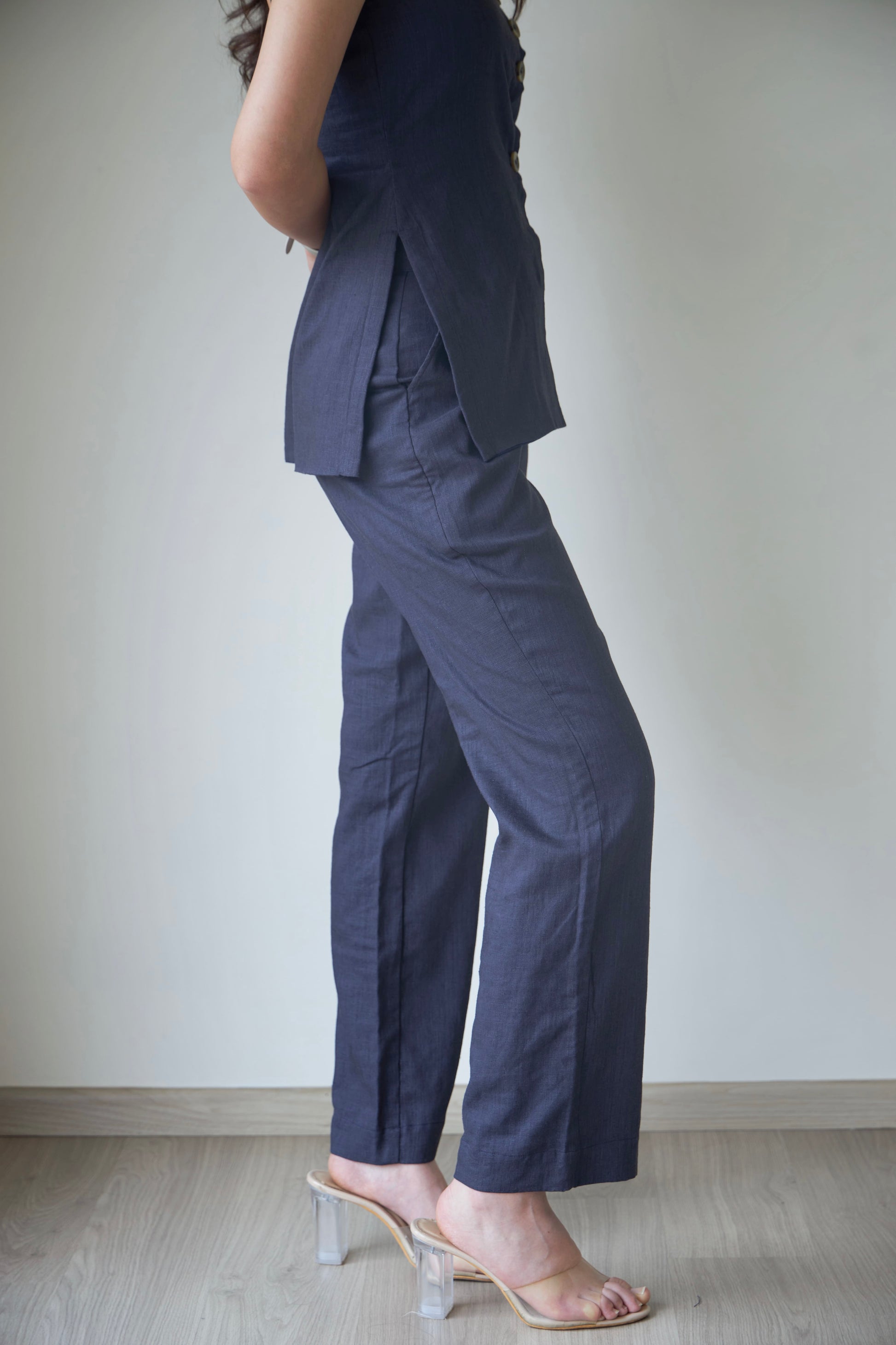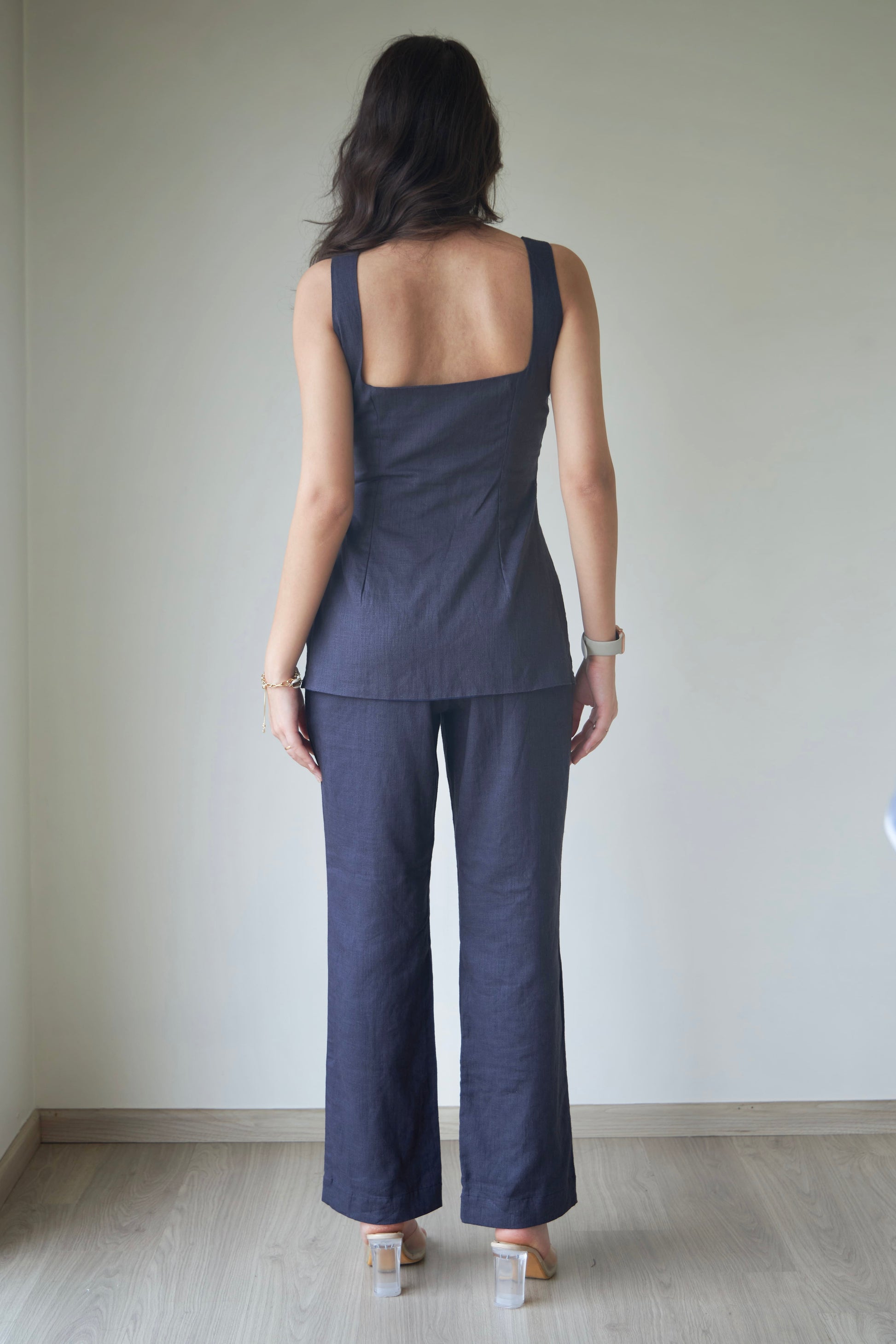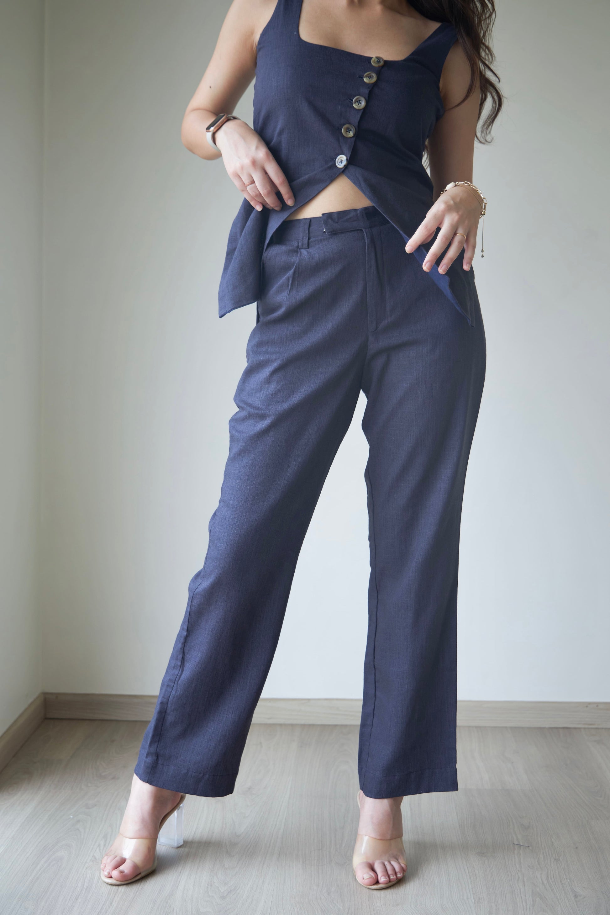 Introducing the Dusky Blue Pant Set, a perfect blend of style and comfort for your summer adventures. This set features a square neck top with a buttoned front, complete with center and side slits that enhance its breezy, summery vibe. Paired with parallel trousers that boast a button fly opening and convenient side cut pockets.