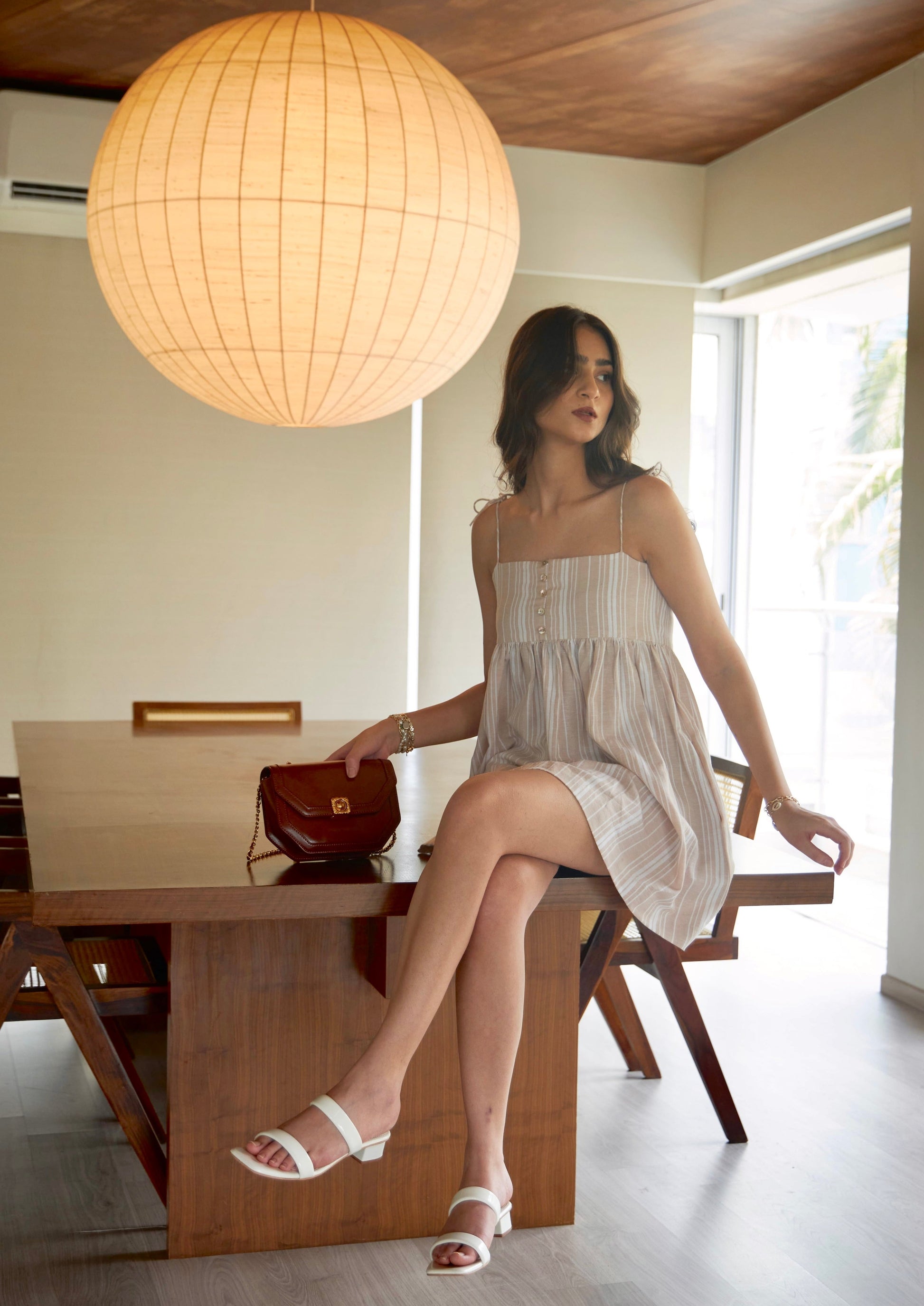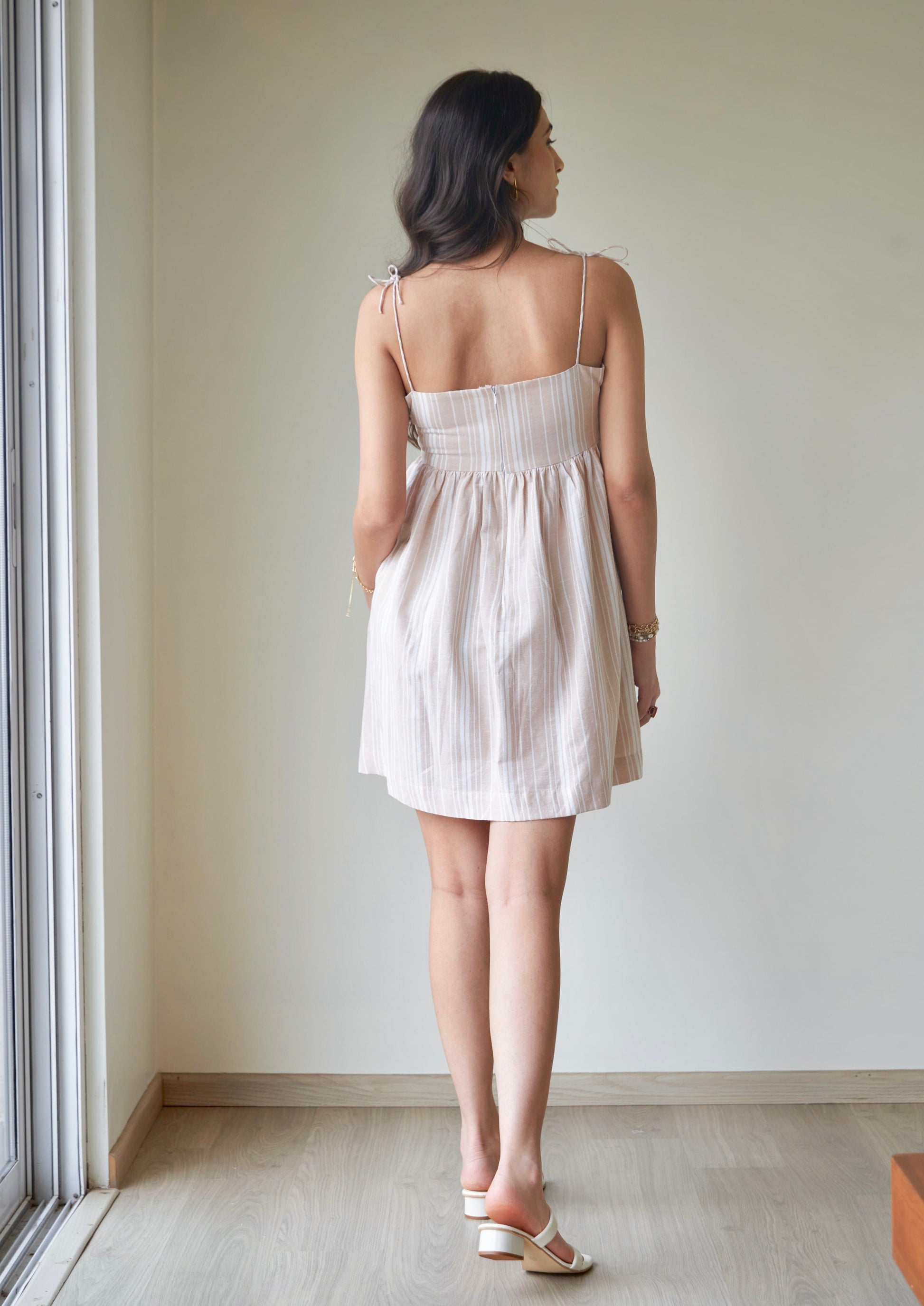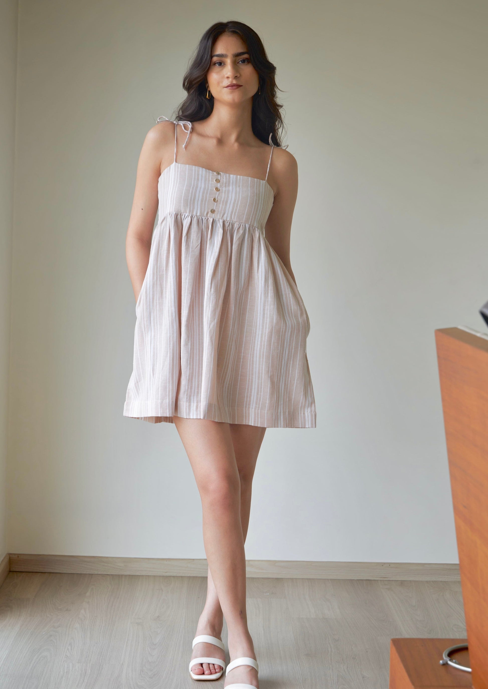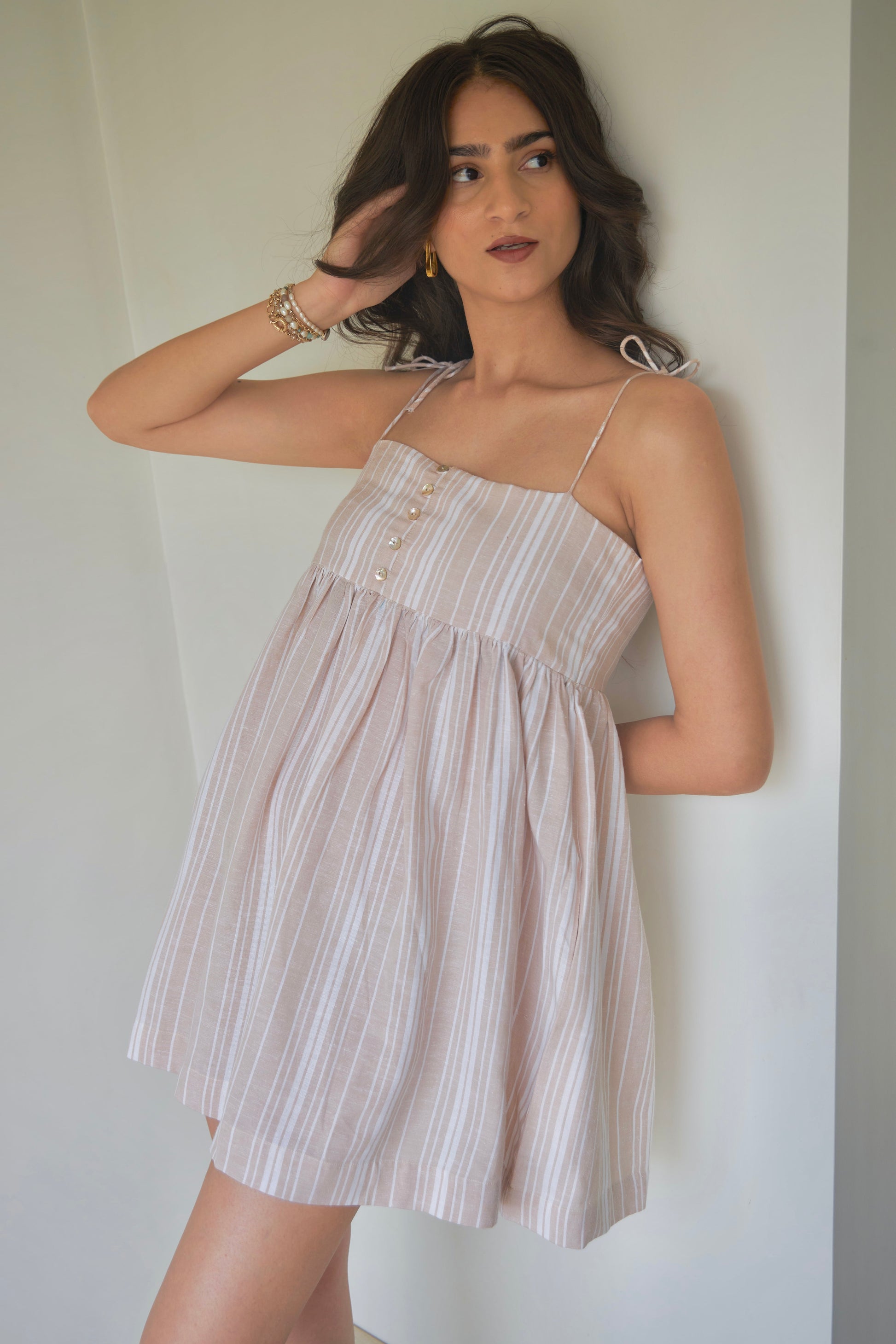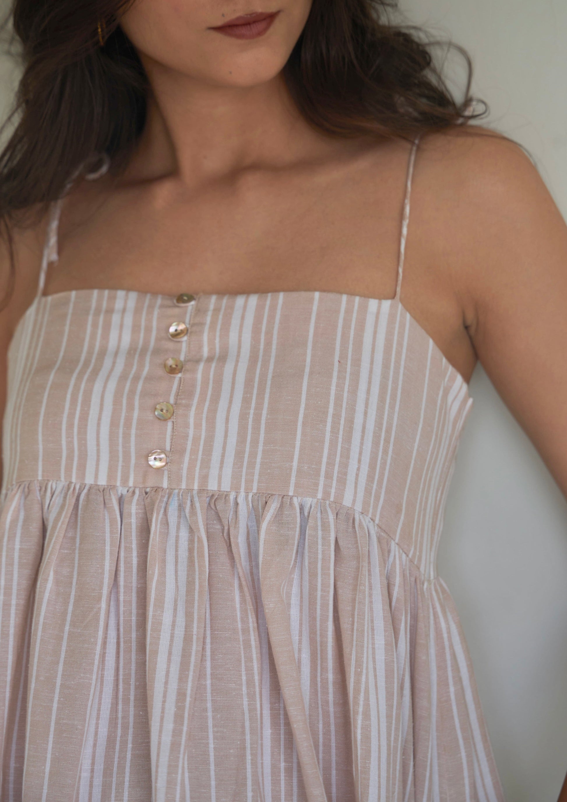 Meet the Vanilla Striped & Gathered Dress—your new favourite summer staple. Crafted from breathable cotton, this dress is as comfortable and easy-going as it looks. Featuring a center back zip, show buttons in the front, and convenient pockets on either side, it's both stylish and practical.