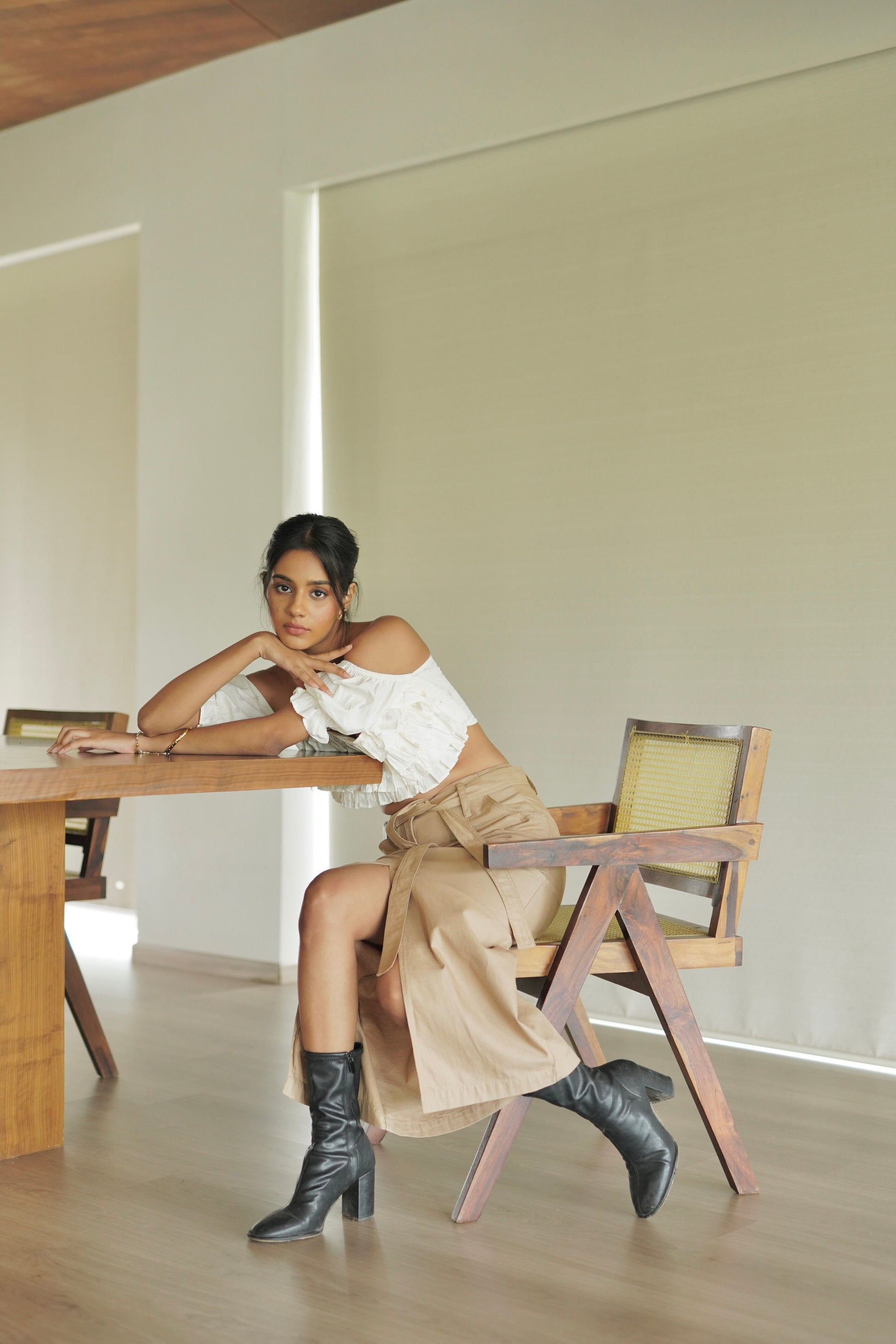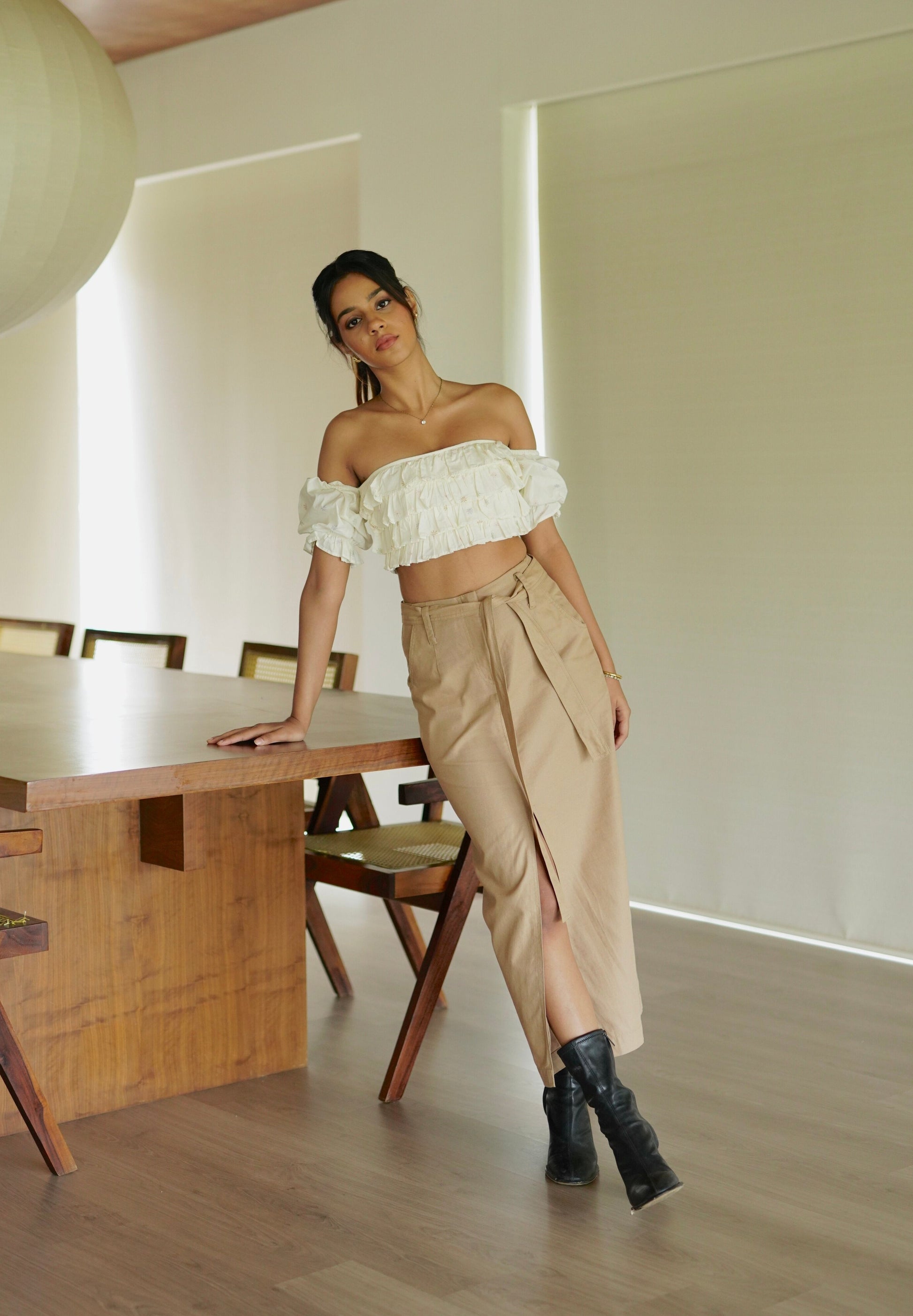 Introducing the perfect medium beige skirt, featuring a front slit, side pockets, and an ideal calf length suitable for all heights. To enhance and complete your look, we've added topstitching details and included a removable waist belt.