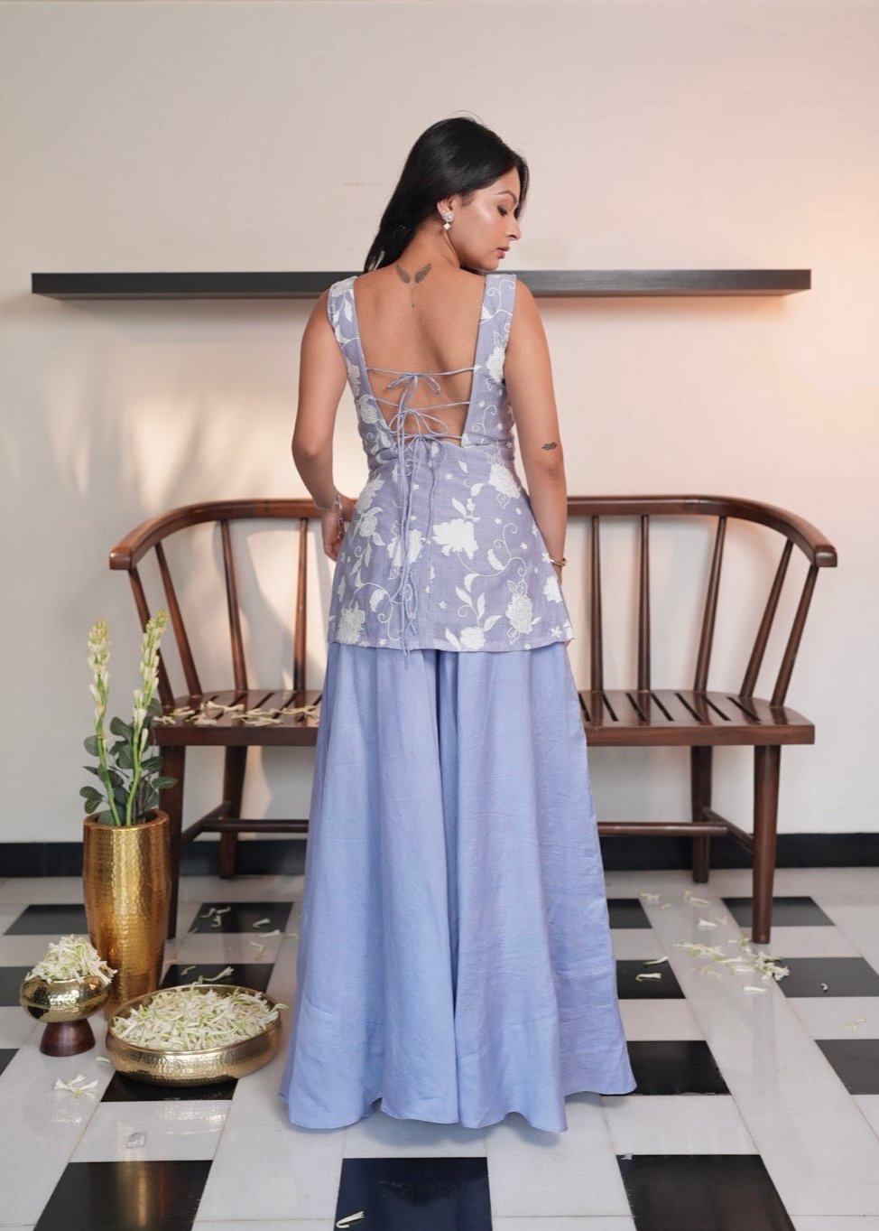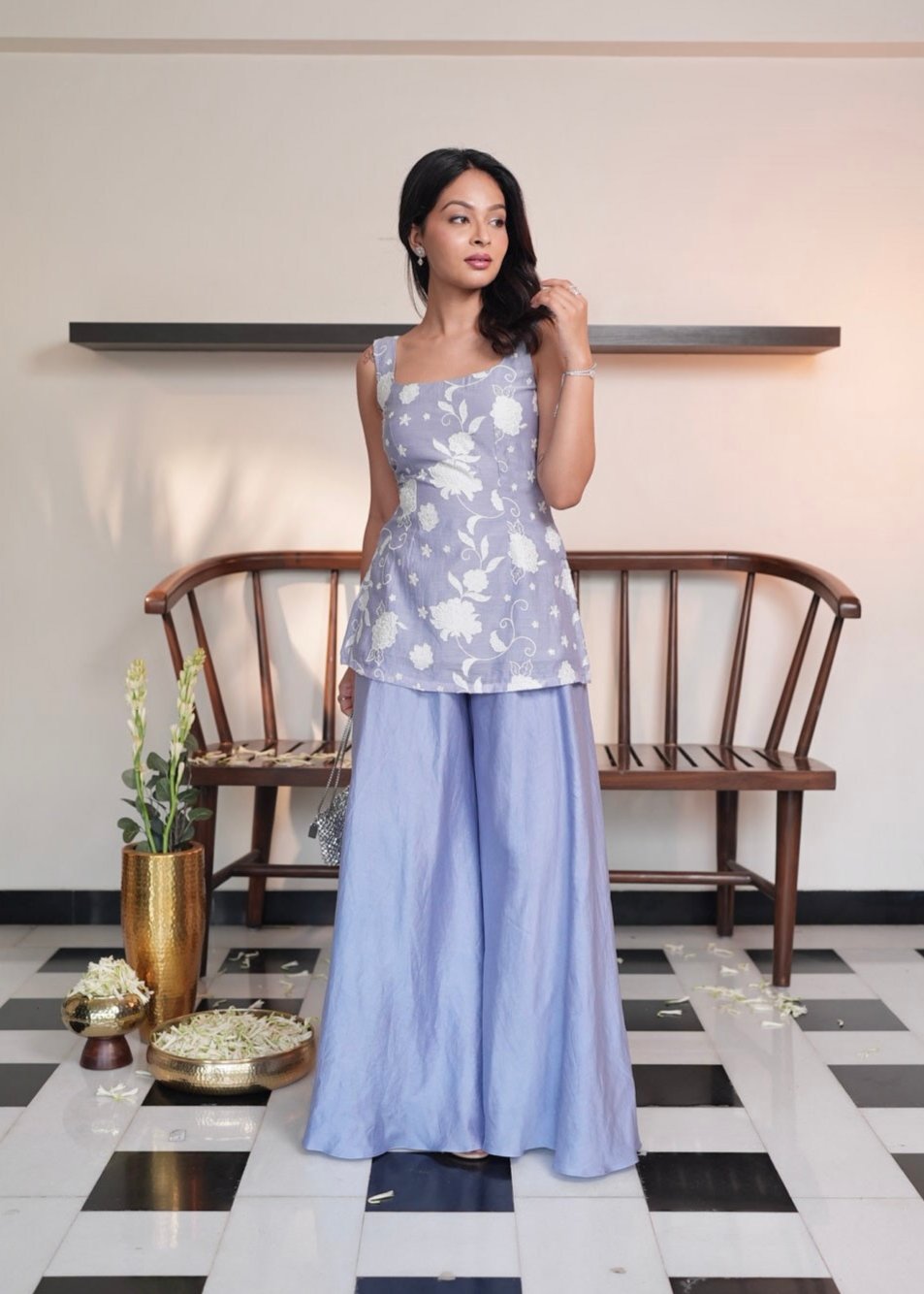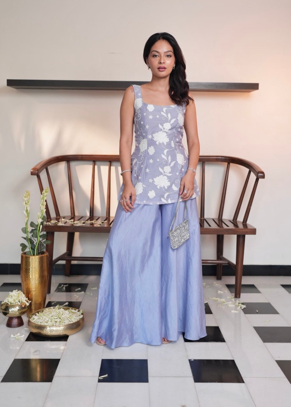 Crafted in pure Chanderi Silk with delicate hand done applique work, this set features a backless top with tie ups and slits on the either side for effortless shape and comfort. Paired with wide legged, full flared bottoms complete with a side pocket. These are both comfortable and give the overall outfit a flattering silhouette.