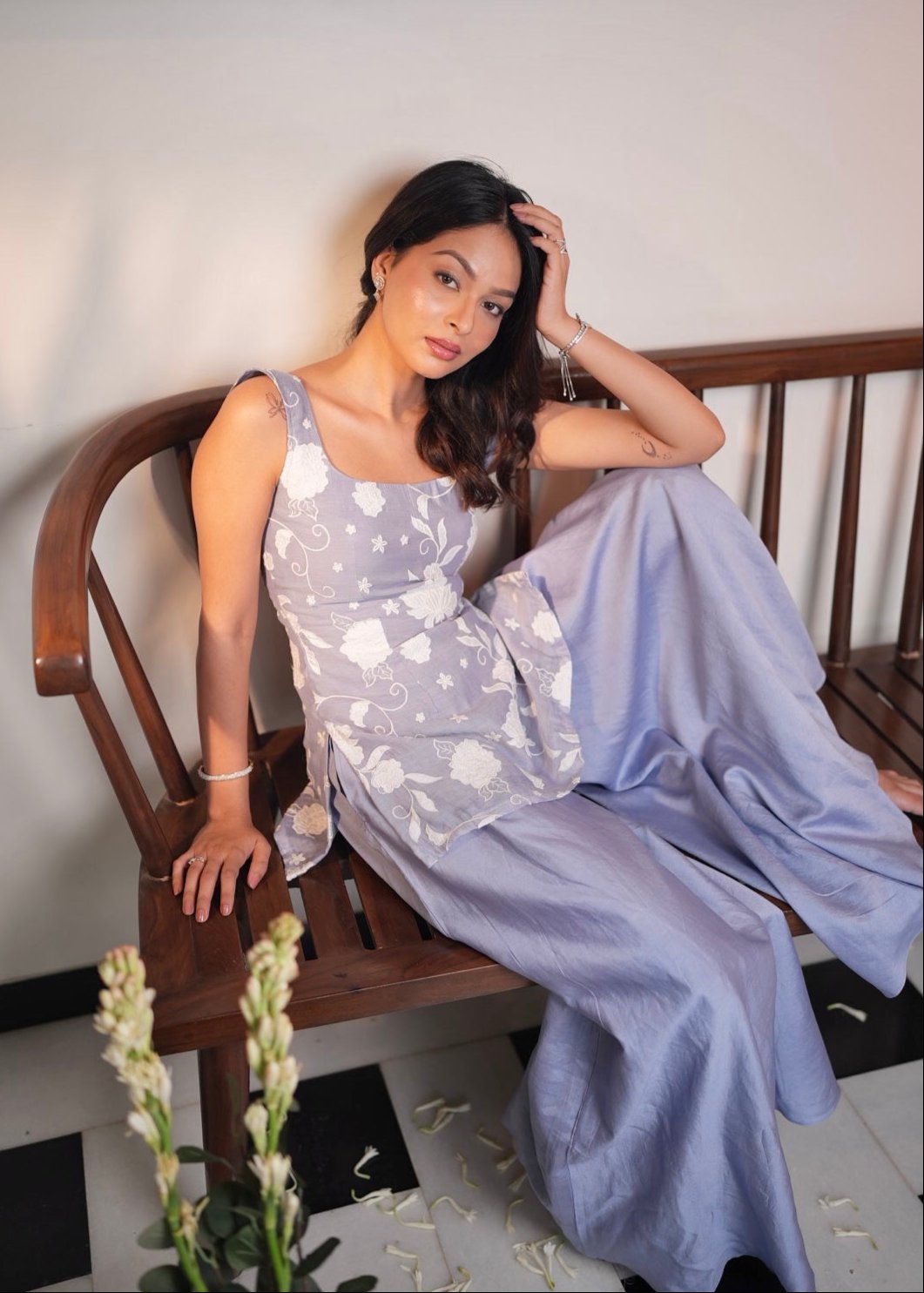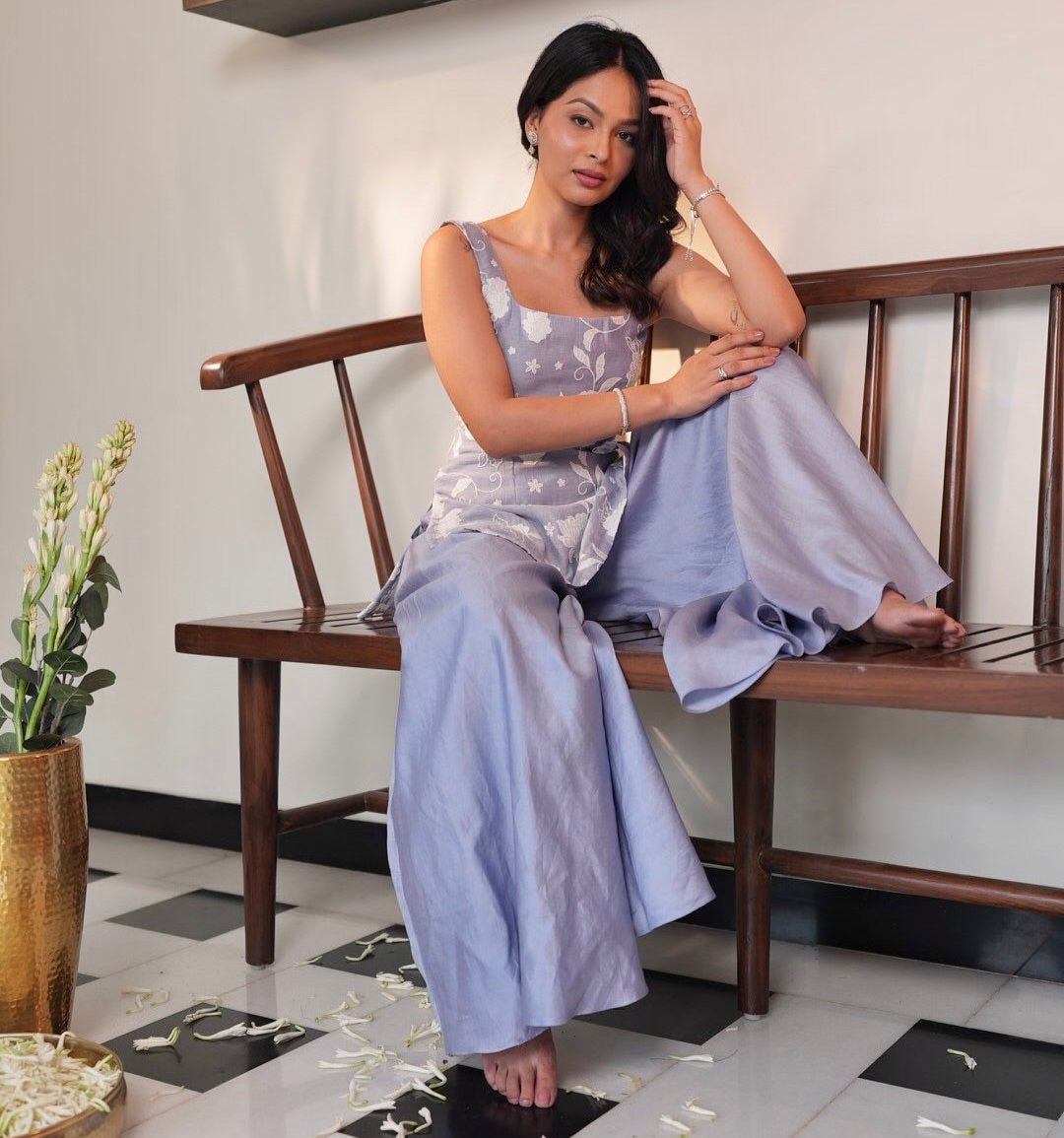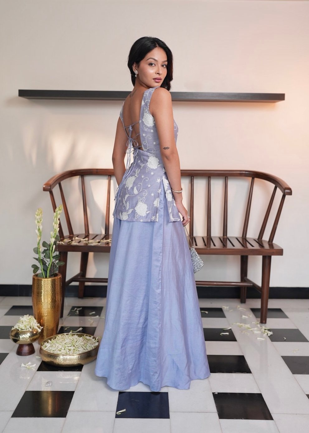 Crafted in pure Chanderi Silk with delicate hand done applique work, this set features a backless top with tie ups and slits on the either side for effortless shape and comfort. Paired with wide legged, full flared bottoms complete with a side pocket. These are both comfortable and give the overall outfit a flattering silhouette.