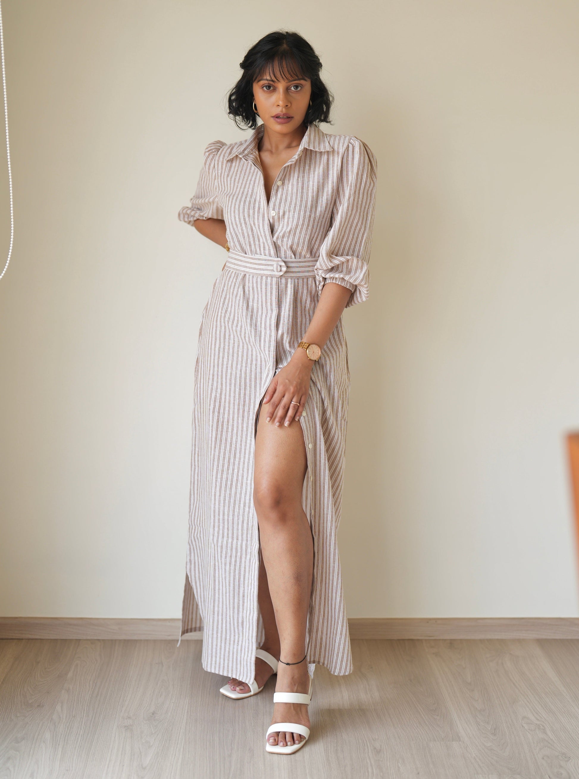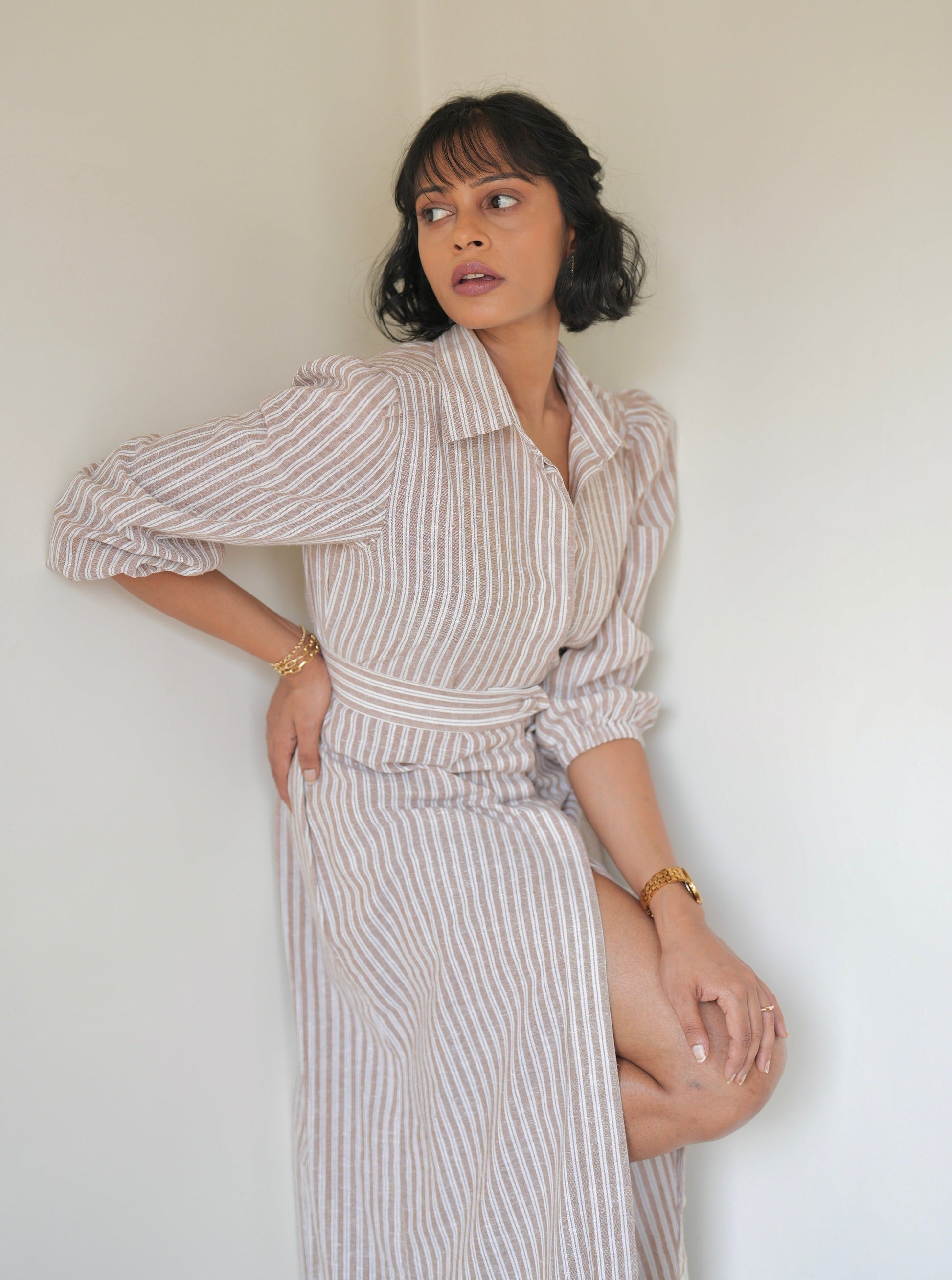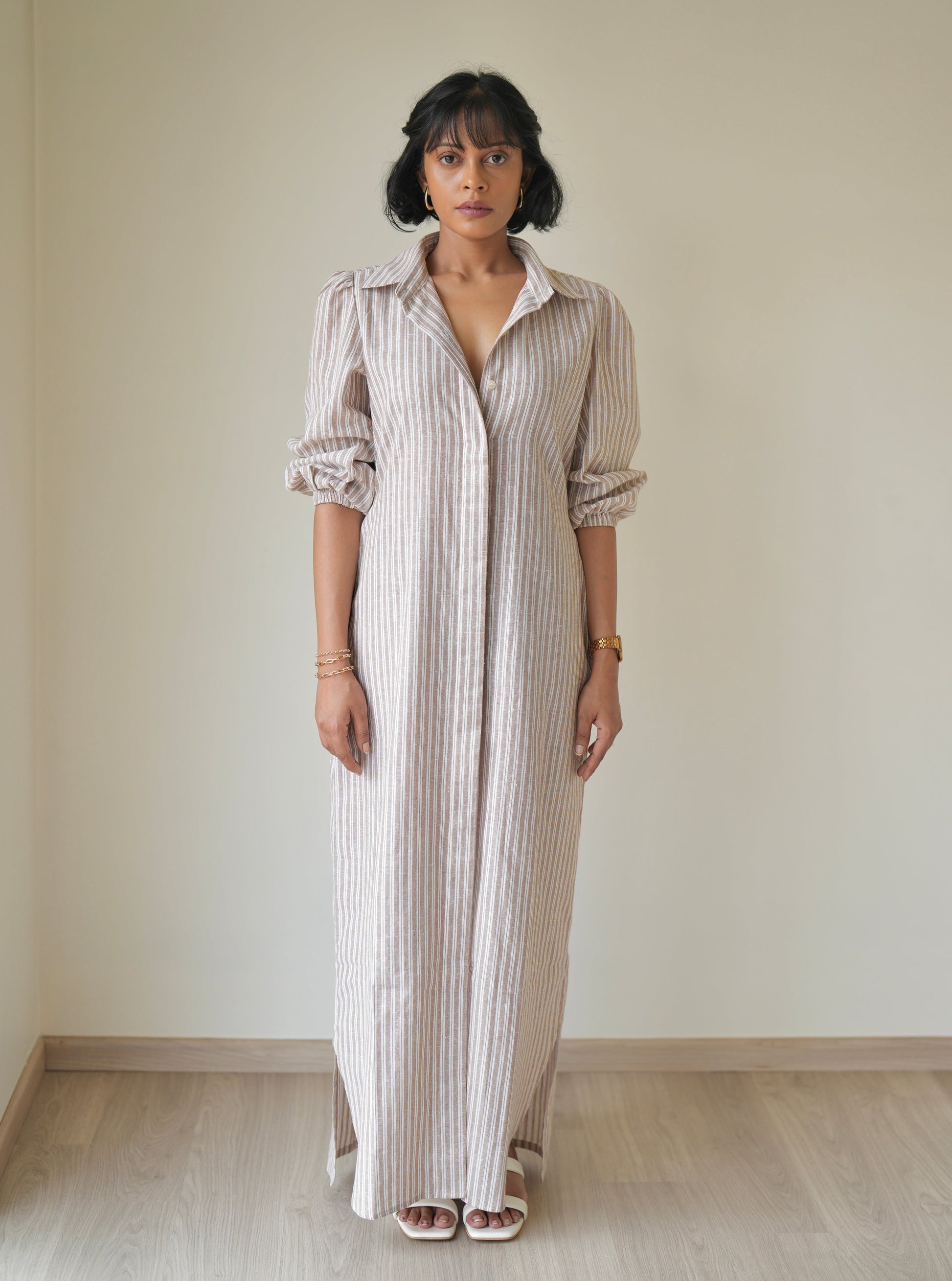 Made from linen cotton, the Sand Striped Shirt Dress is light, airy, and perfect for those sunny days. This full-length dress features a concealed button placket, giving you options to wear it open or closed, and comes with two handy side pockets and a detachable belt for a tailored finish.