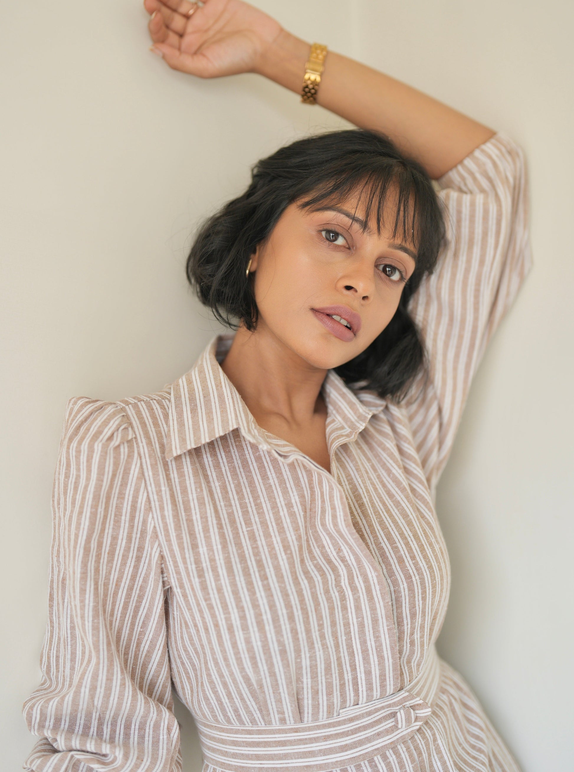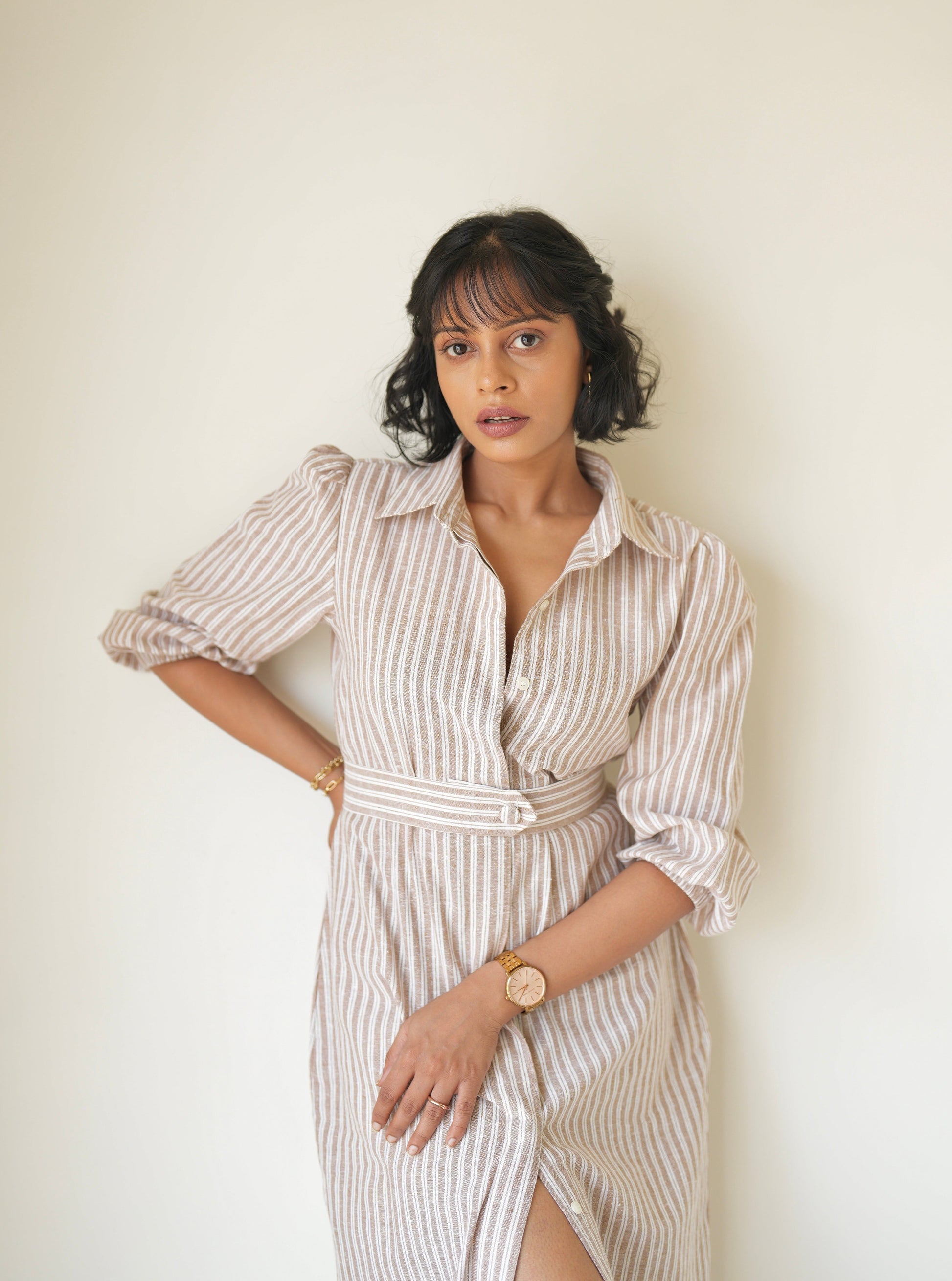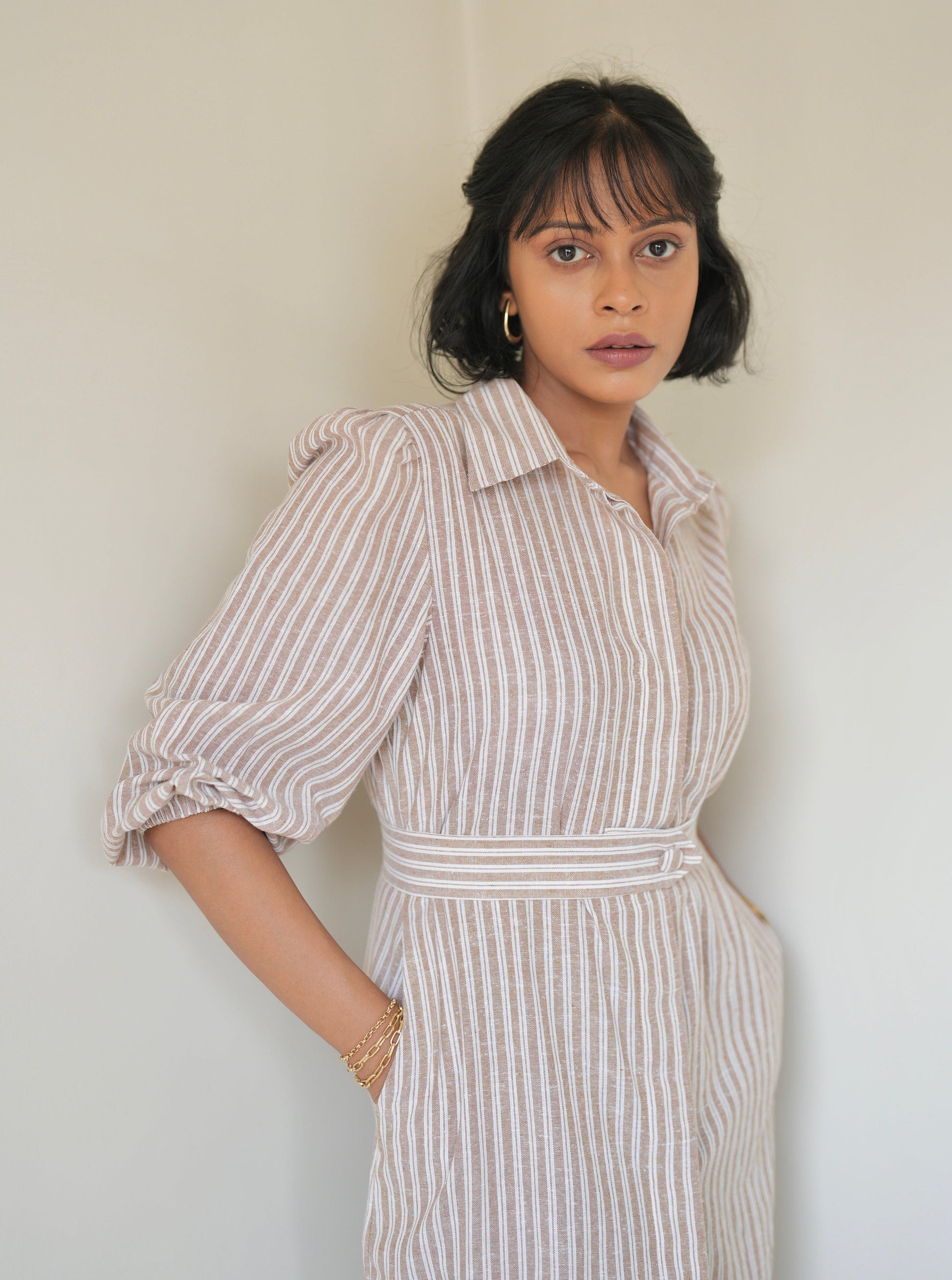 Made from linen cotton, the Sand Striped Shirt Dress is light, airy, and perfect for those sunny days. This full-length dress features a concealed button placket, giving you options to wear it open or closed, and comes with two handy side pockets and a detachable belt for a tailored finish.